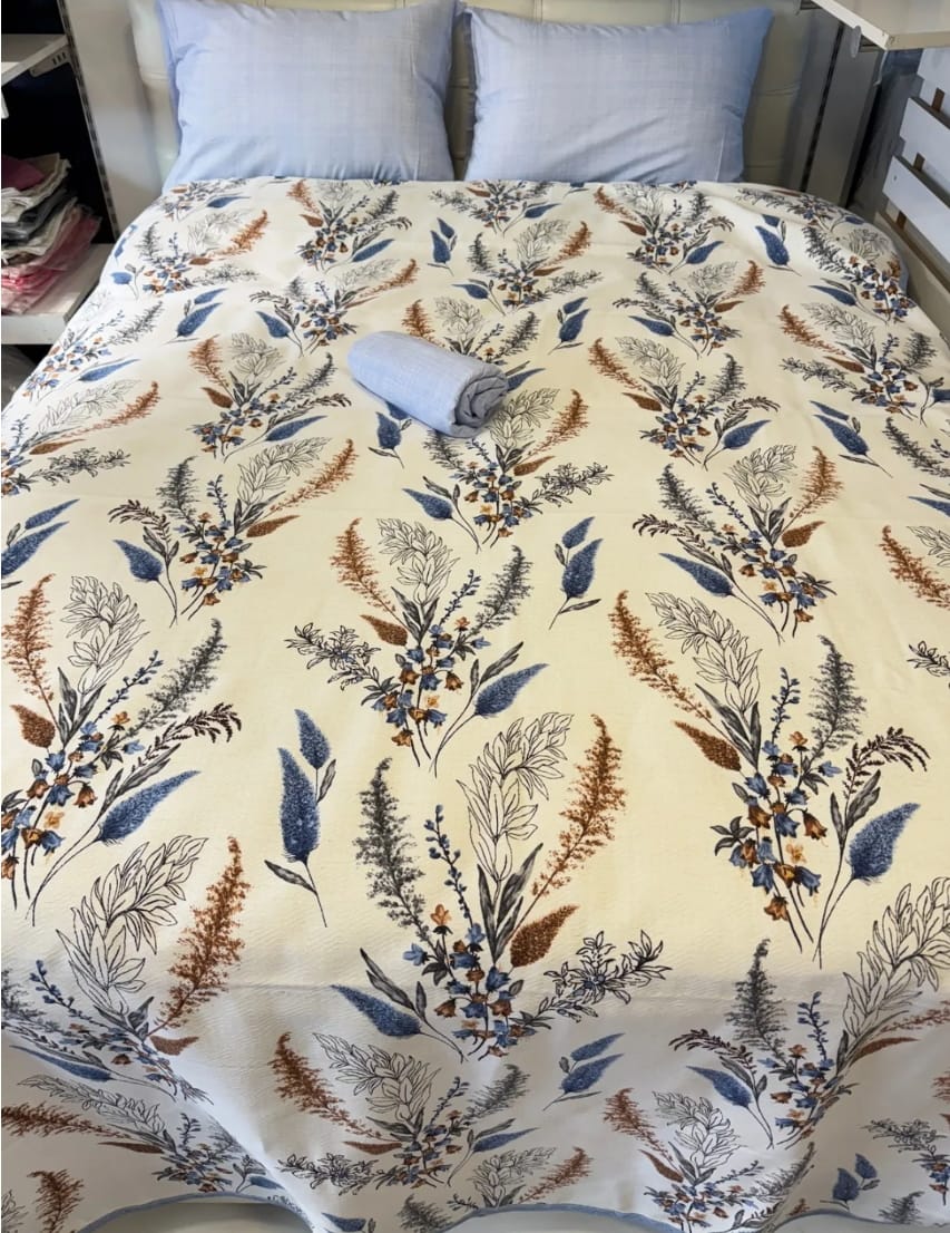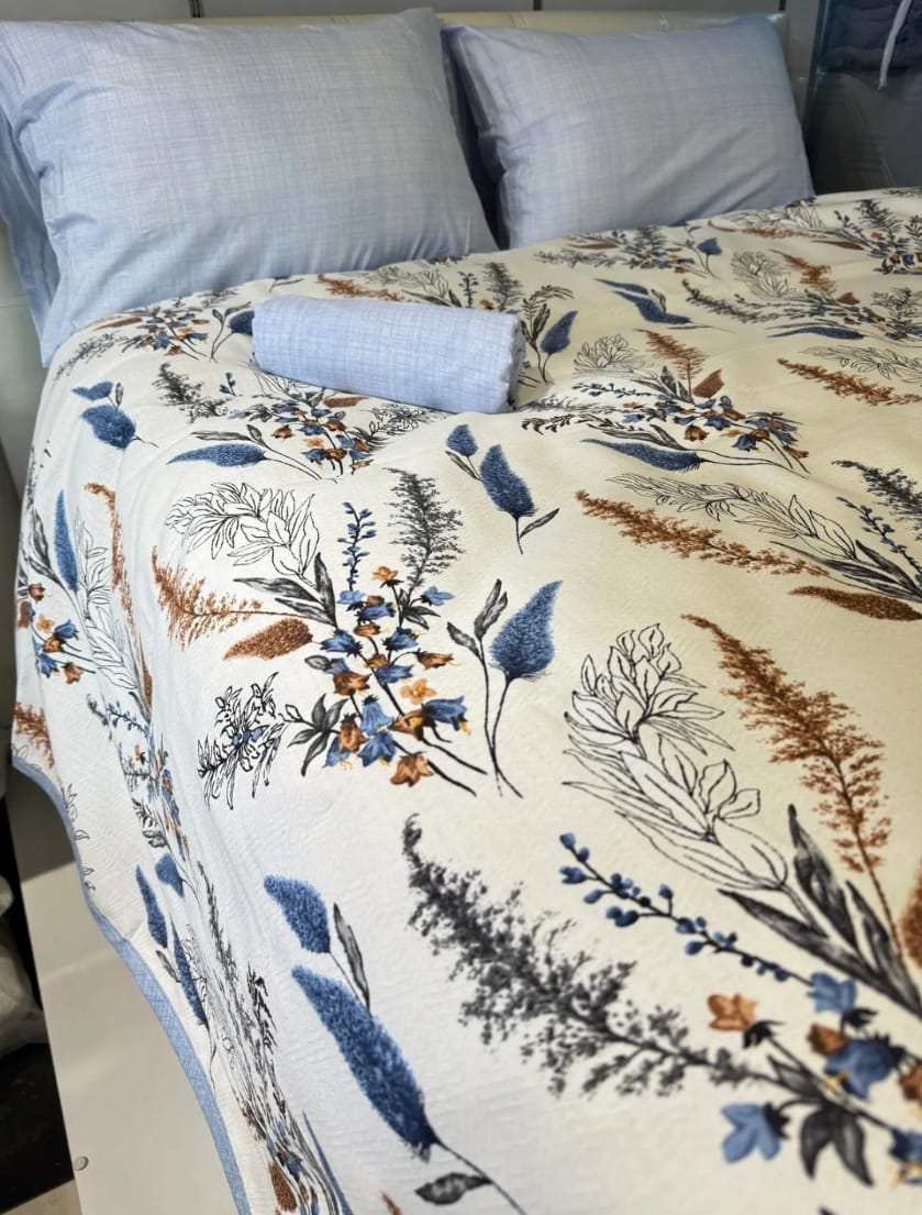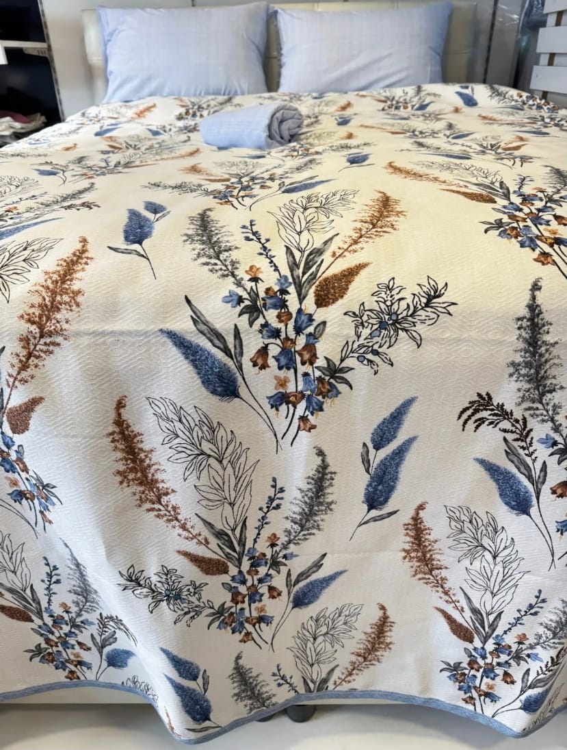 Pikenin göz alıcı çiçek desenleri, mekânınıza canlılık katarken, mavi detaylar sayesinde ferah bir atmosfer yaratır. Uyumlu renk paleti, odanızda huzurlu bir atmosfer oluştururken, çiçek desenleri yaz mevsiminin enerjisini yansıtır. Gündüzleri dekoratif bir örtü olarak kullanabileceğiniz bu pikeyi, akşamları sıcak havalarda hafif bir örtü olarak rahatlıkla kullanabilirsiniz.