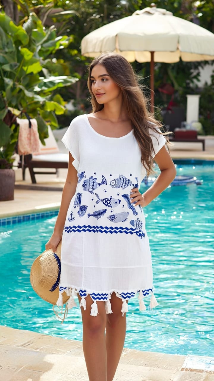Sıcak yaz günlerinin vazgeçilmezi olan Pamuklu Viskon Plaj Elbisesi, hem şıklığı hem de rahatlığıyla plajda kimliğinizi ortaya koymanıza yardımcı oluyor. Mavi desenleri ve beyaz zemin rengi ile dikkat çeken bu elbise, yaz aylarında güneşin tadını çıkarırken stilinizi korumanızı sağlıyor.
