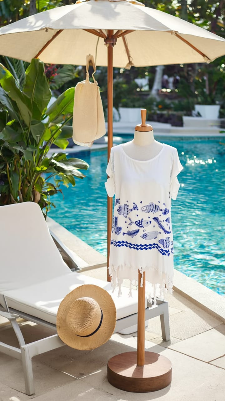 - Renk ve Desen: Mavi desenler ile zenginleştirilmiş beyaz zemin, hem şık hem de modern bir görünüm yaratır. Plajda ve havuz başında dikkat çekici bir stil sunar.